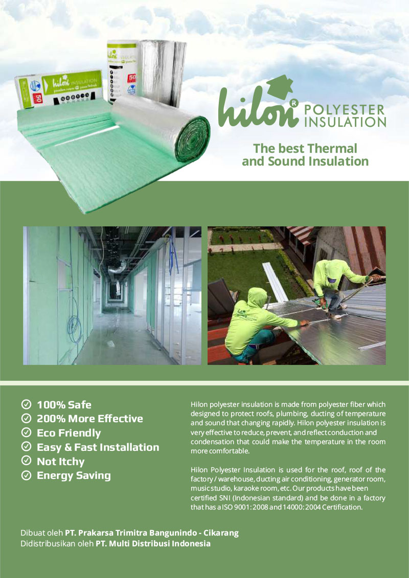Dengan kemudahan penggunaannya sehingga dapat memberikan udara yang lebih sejuk, peredam panas ramah lingkungan Hilon Polyester Insulation hadir dengan bahan Polyester fiber yang dirancang untuk melindungi atap dan pipa anda, dari suhu serta suara yang berubah-ubah secara cepat.