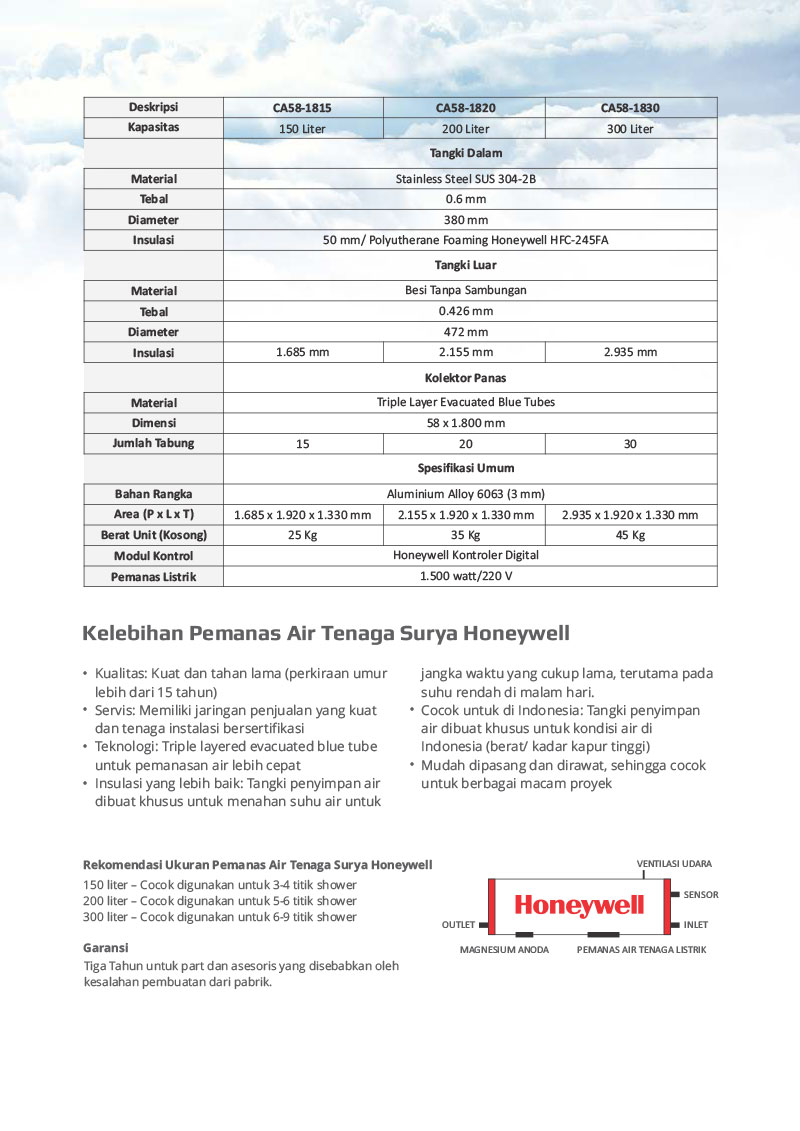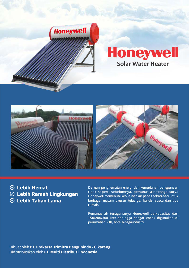 Dengan penghematan energi dan kemudahan penggunaan tidak seperti sebelumnya, pemanas air tenaga surya Honeywell memenuhi kebutuhan air panas sehari-hari untuk berbagai macam ukuran keluarga, kondisi cuaca dan tipe rumah.