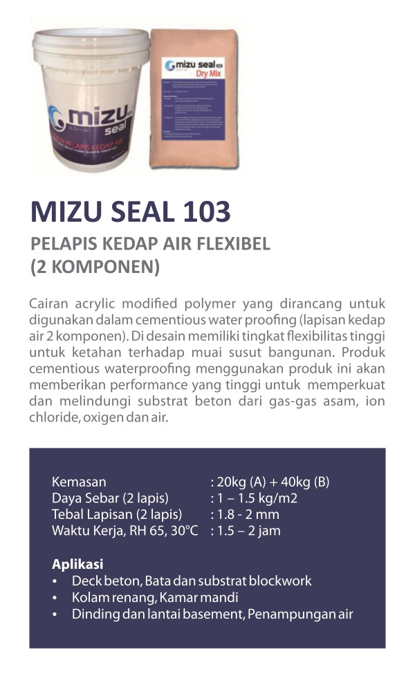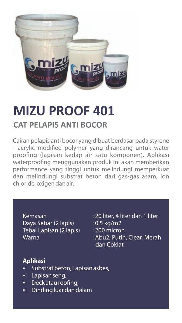 Mizu water proofing dirancang dan diproduksi oleh pabrik dengan jangkauan internasional untuk mampu bertahan lama di segala kondisi cuaca yang ekstrem, elastis, daya rekat tinggi, cepat kering dan mudah untuk diaplikasikan.